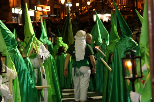 Resultó, un año más, especialmente meritoria la salida del paso de la Virgen en el que los costaleros tuvieron que colocarse a gatas ante las escasas dimensiones de la puerta del templo. El cortejo incluyó a mujeres ataviadas de mantilla y a penitentes, así como miembros de diferentes cofradías y sayones del Ecce-Homo. Los portadores de los tronos tuvieron que emplearse a fondo para culminar con éxito el giro en la intersección entre las calles Antón Alcalá (Horno) y Guardia Castellano (Gala). El acompañamiento correspondió a la Agrupación Musical Virgen de la Esperanza. Fuente: Diario JAÉN |