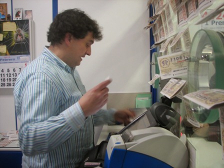 Luis Merino no dejaba de reir, decía que se sentía muy contento, aunque reconoce, que en principio las ventas no han aumentado y añadió que los lunes, sus clientes son así, «la gente viene a mirar su quiniela, su primitiva, sus billetes de la Lotería. Luis Merino no paraba de sonreir, sus clientes le seguían pidiendo números, algunos lo tenían claro y le solicitaban cualquier terminación, otros confiaban en la intuición de Luis y éste seguía atendiendo a todos los que llegaba y la sonrisa no disminuía de su boca y no dejaba de ilusionar como si fuese un mago.