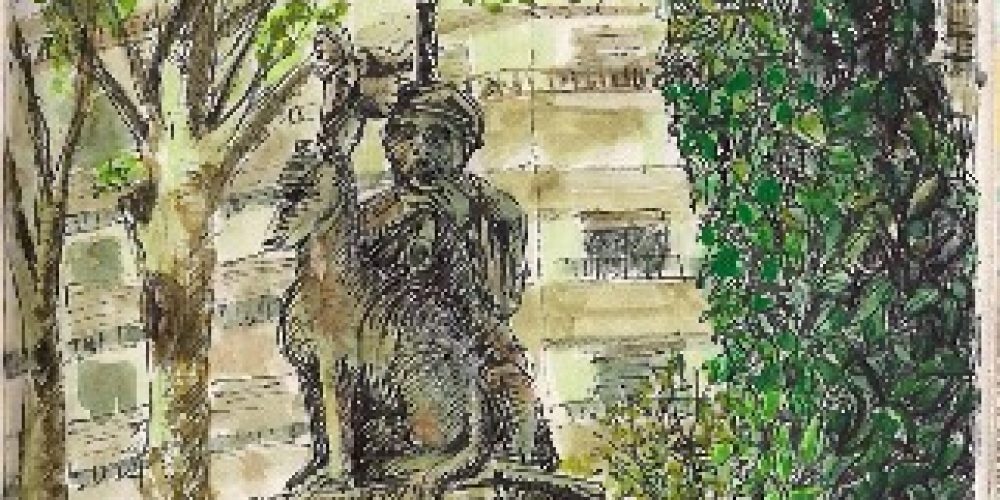 El parque tiene varias estatuas. Personalmente tengo mi favorita: ese músico-pastor con su perro a su vera, bajo un pino recio cuyo tronco es abrazado por la hiedra. Vicente Moreno lo esculpió y dejó en él latente su mundo de alegorías.